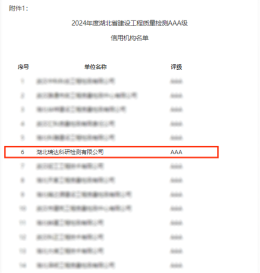 近日,湖北省建设工程质量安全协会发布了2024年度湖北省建设工程质量检测AAA级信用机构评价结果,瑞达科研检测公司凭借优异的诚信建设和信用管理能力,荣获最高级“AAA级”信用机构评价。
